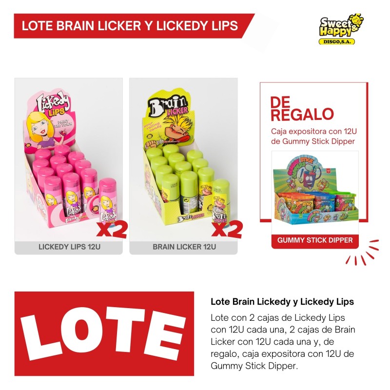 2 CAJAS DE 12U DE BRAIN LICKER, 2 CAJAS DE 12U DE LICKEDY LIPS Y 12 U DE GUMMY STICK DIPPER