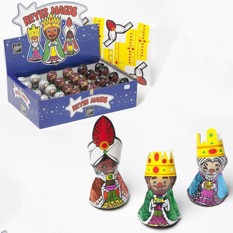 Bote de 24 figuritas de reyes magos de chocolate. Sin gluten